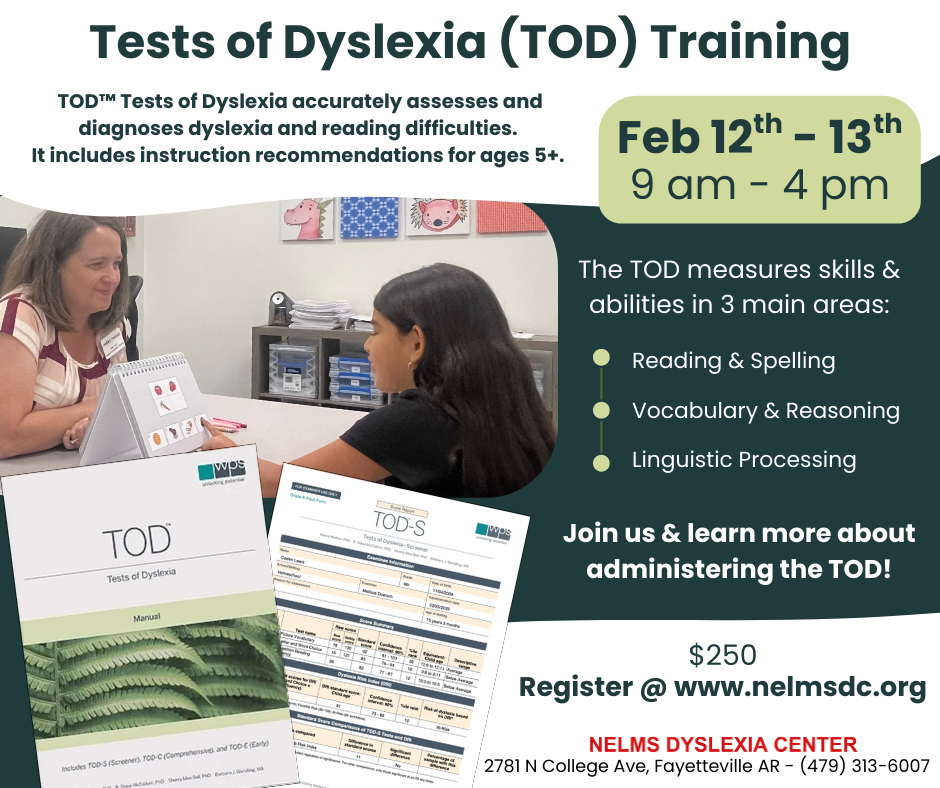 The Nelms Dyslexia Center is dedicated to empowering people in the dyslexia community to achieve their greatest potential by providing training, therapy, information and support.